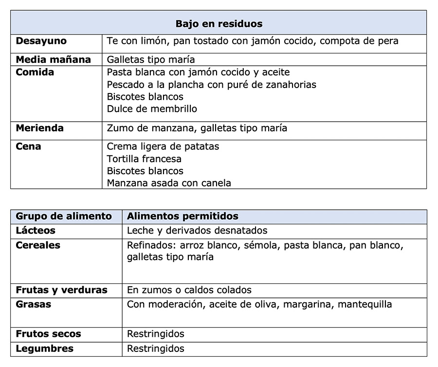 Se recomienda una alimentación con bajo contenido en residuos para reducir al mínimo el volumen y peso del bolo fecal.