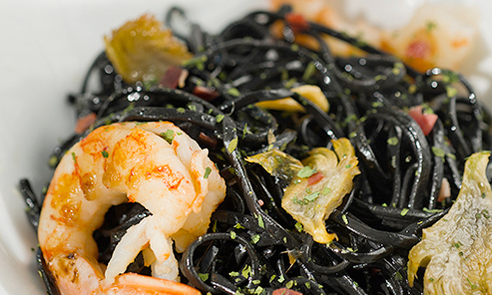 Receta Tagliatelle al nero di sepia con langostino gambón, alcachofas y jamón